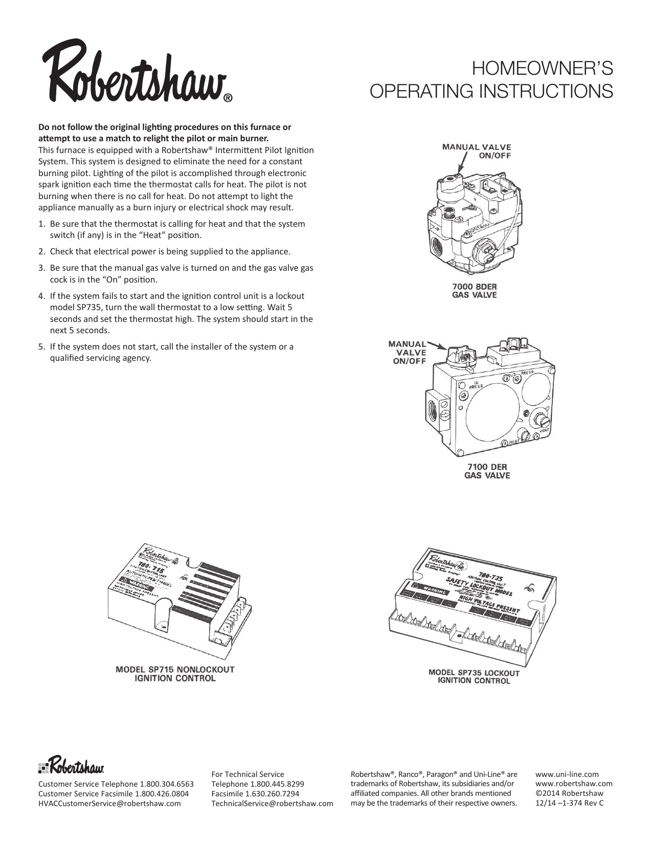 Robertshaw Intermittent Pilot Ignition System Homeowners Instructions | Manualzz