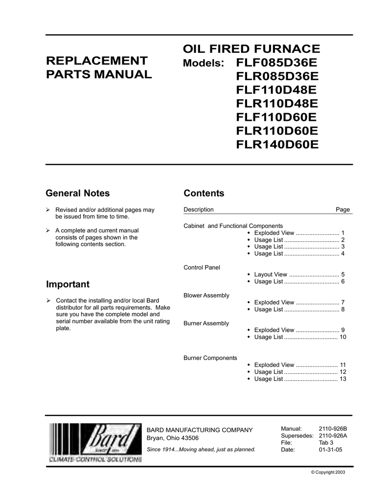 Oil Fired Furnace Replacement : Flf085D36E Parts Manual | Manualzz